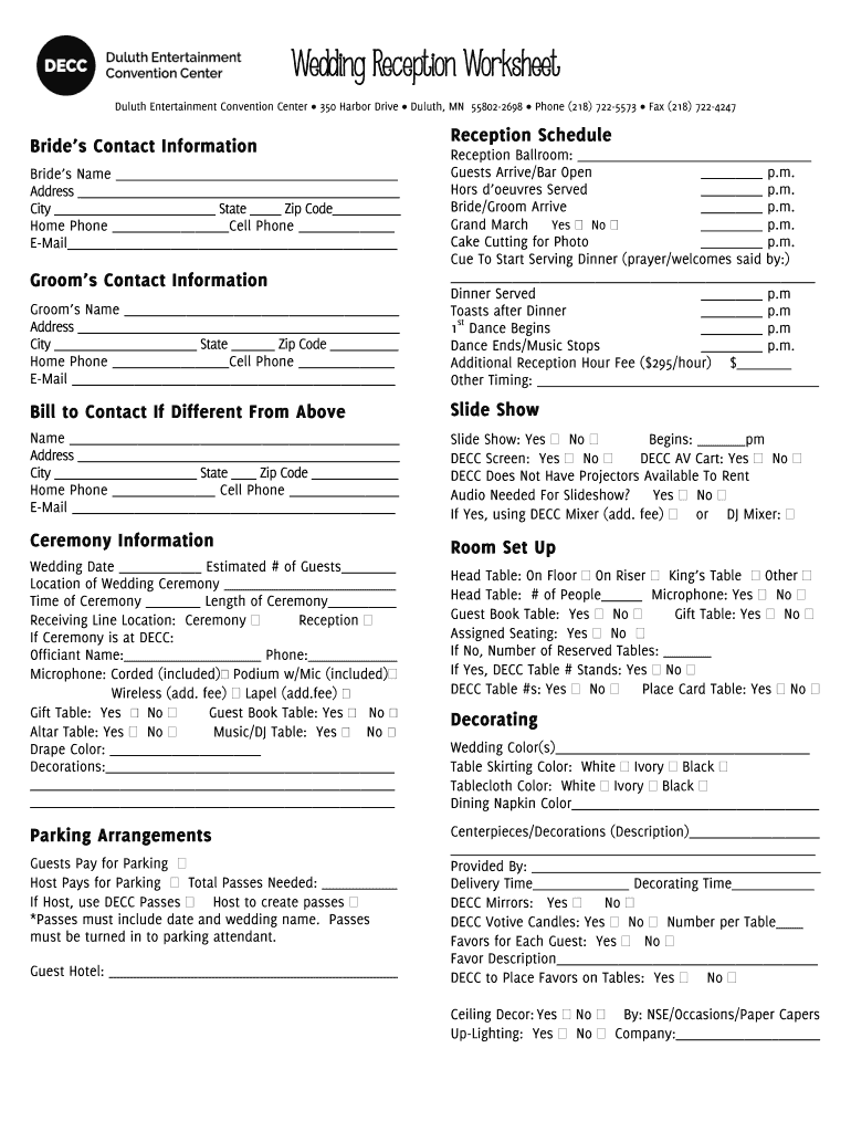 Wedding Reception Worksheet Duluth Entertainment Convention Center 350 Harbor Drive Duluth, MN 558022698 Phone (218× 7225573 Fax (218× 7224247 Brides Contact Information Reception Schedule Grooms