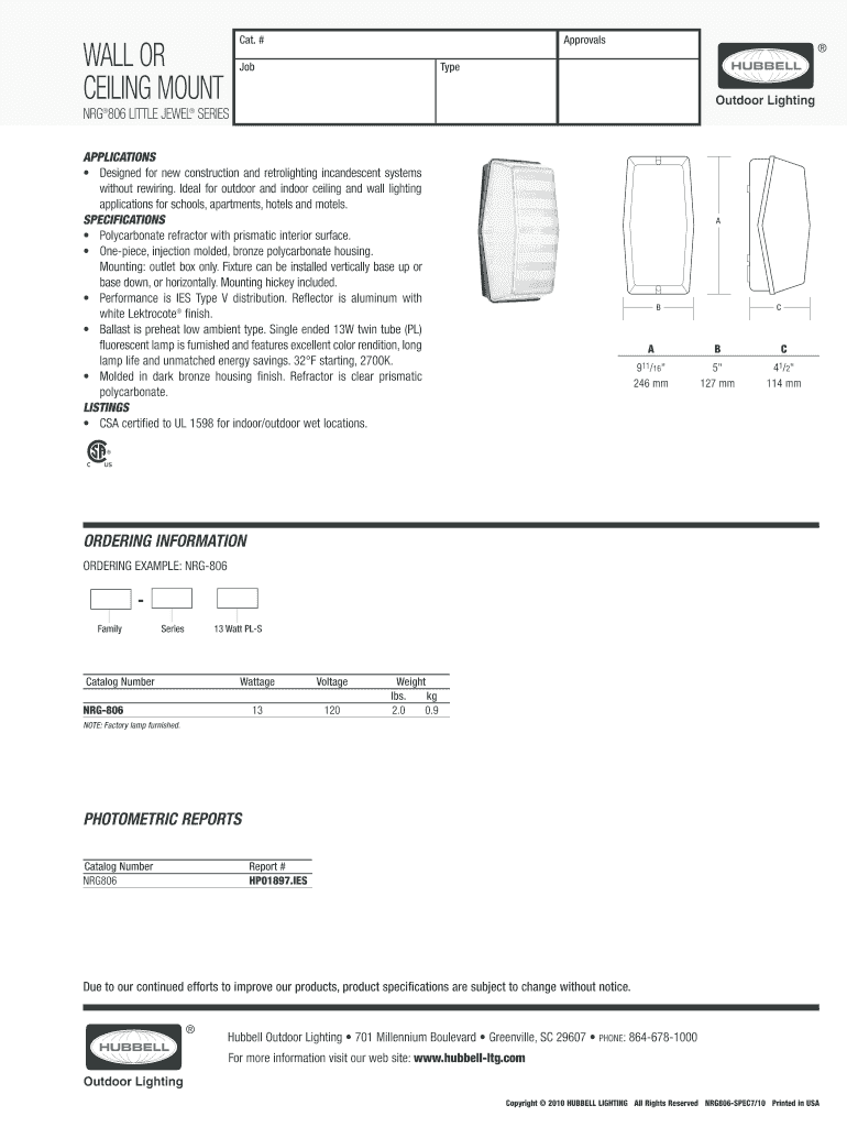 Cat. # WALL OR CEILING MOUNT Approvals Job Type Outdoor Lighting NRG806 LITTLE JEWEL SERIES APPLICATIONS Designed for new construction and retro lighting incandescent systems without rewiring. Ideal