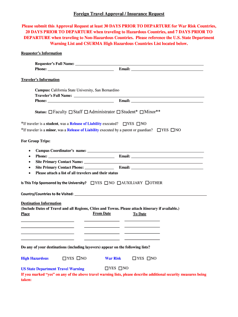 Foreign Travel Approval / Insurance Request Please submit this Approval Request at least 30 DAYS PRIOR TO DEPARTURE for War Risk Countries, 20 DAYS PRIOR TO DEPARTURE when traveling to Hazardous Countries,