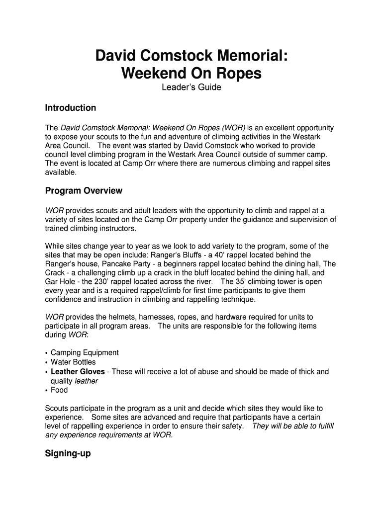 David Comstock Memorial: Weekend On Ropes Leaders Guide Introduction The David Comstock Memorial: Weekend On Ropes (FOR) is an excellent opportunity to expose your scouts to the fun and adventure