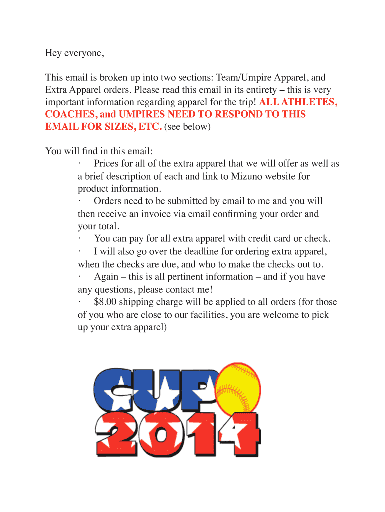 Hey everyone, This email is broken up into two sections: Team×Umpire Apparel, and Extra Apparel orders. Please read this email in its entirety this is very important information regarding apparel