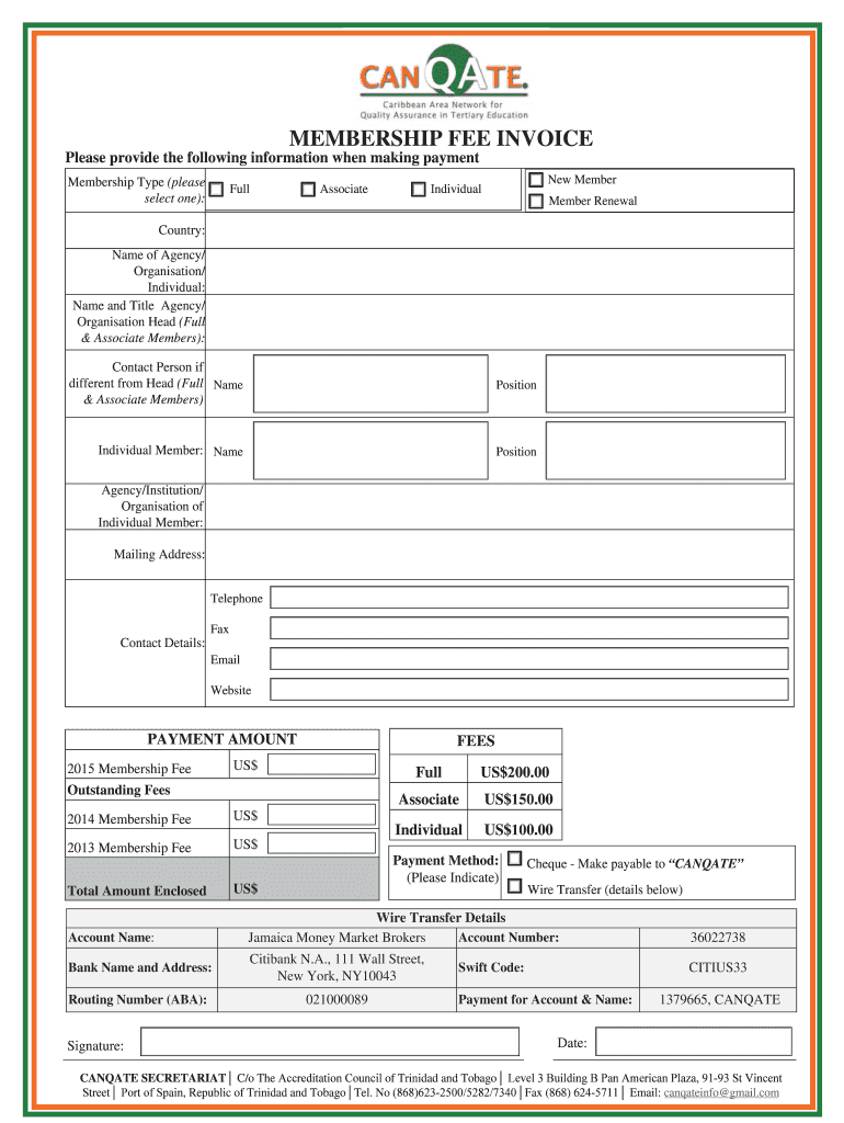 MEMBERSHIP FEE INVOICE Please provide the following information when making payment Membership Type (please select one): Full Associate New Member Individual Member Renewal Country: Name of Agency/