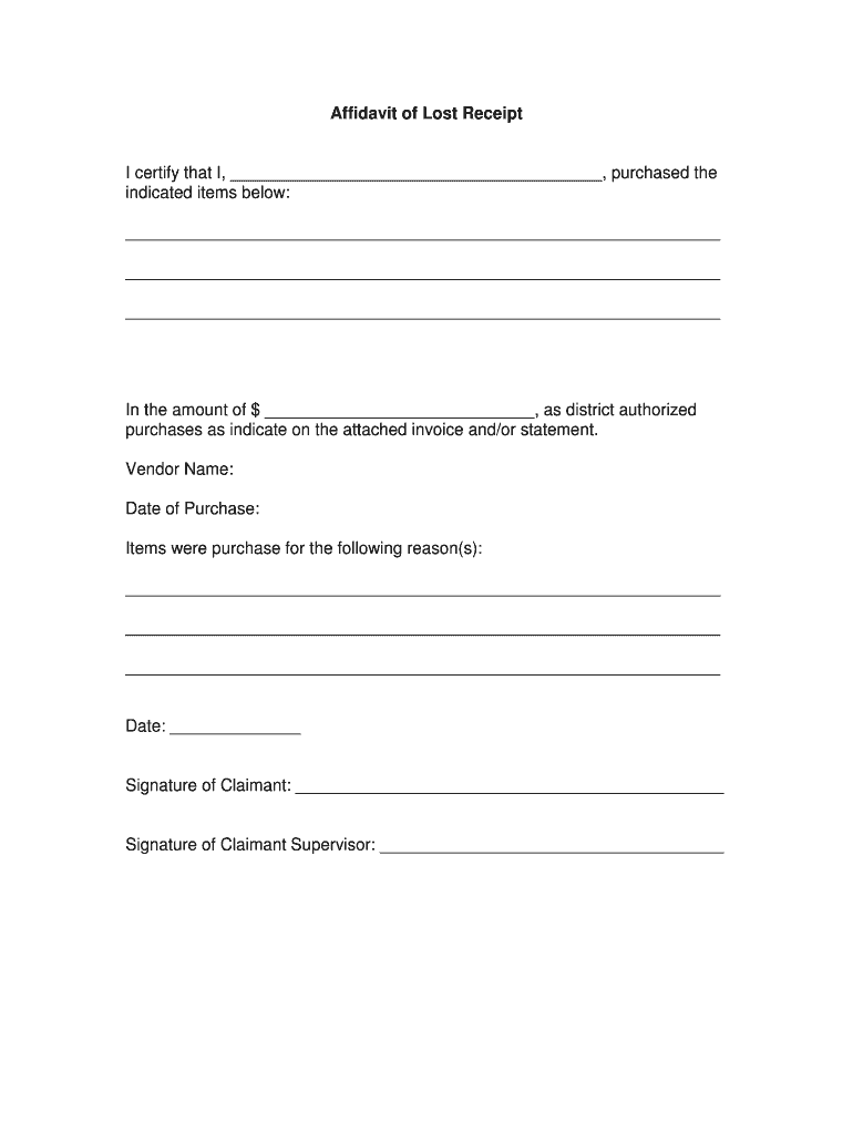 Affidavit of Lost Receipt I certify that I, purchased the indicated items below: In the amount of $, as district authorized purchases as indicate on the attached invoice and×or statement. Vendor