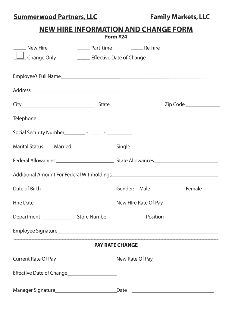 Summer wood Partners, LLC Family Markets, LLC NEW HIRE INFORMATION AND CHANGE FORM #24 New Hire Part time Rehire Change Only Effective Date of Change
