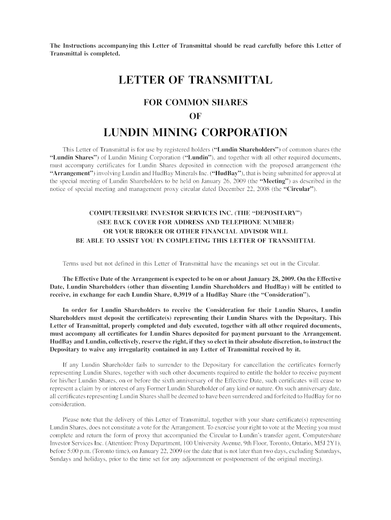 This document is a Letter of Transmittal for the registered holders of common shares of Lundin Mining Corporation, allowing them to deposit their shares in connection with an arrangement involving