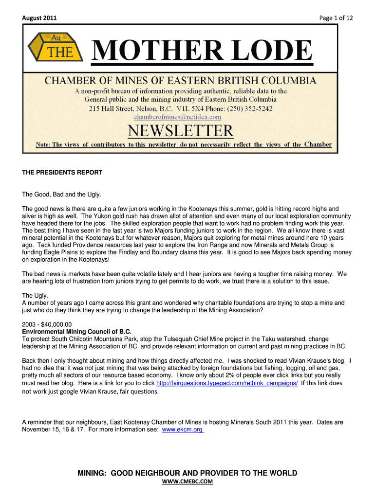 August 2011-Page 1 of 12 THE PRESIDENTS REPORT The Good, Bad and the Ugly. The good news is there are quite a few juniors working in the Kootenai this summer, gold is hitting record highs and silver