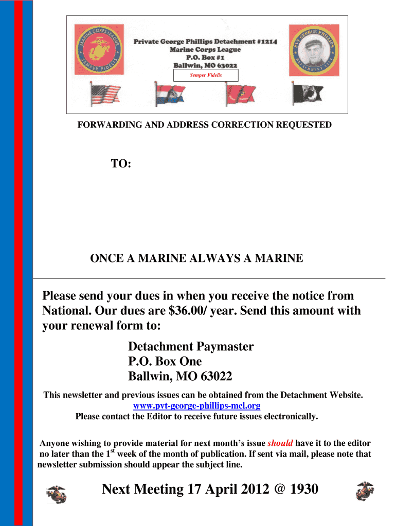 Temper Fidel is FORWARDING AND ADDRESS CORRECTION REQUESTED TO: ONCE A MARINE ALWAYS A MARINE Please send your dues in when you receive the notice from National. Our dues are $36.00/ year. Send this