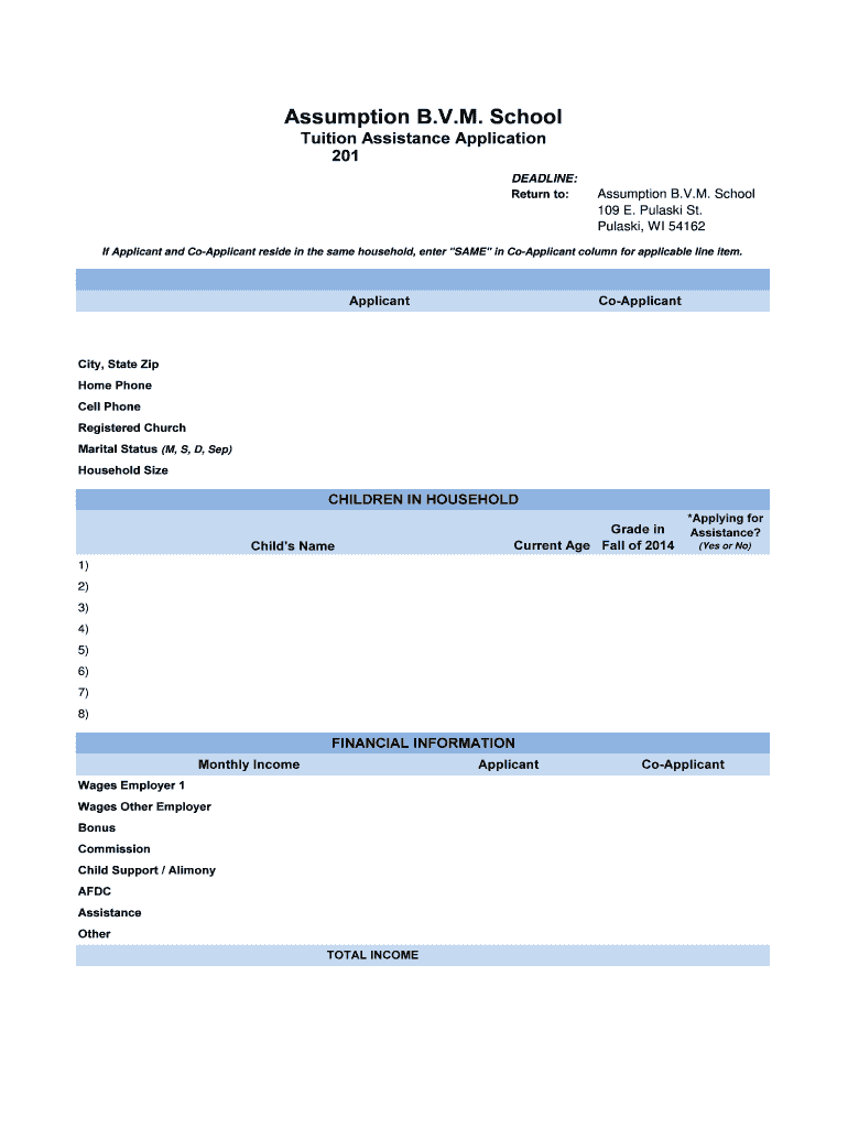 Assumption B.V.M. School Tuition Assistance Application 201 201 School Year * Tuition assistance may be available to families who have one or more students enrolled at Assumption B.V.M. School. Please