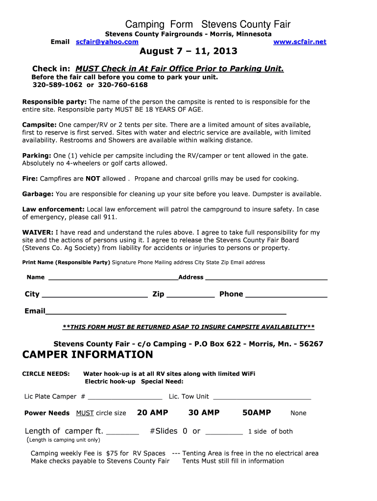 Camping Form Stevens County Fair Email Stevens County Fairgrounds Morris, Minnesota scare yahoo.com www.scfair.net August 7 11, 2013 Check in: MUST Check in At Fair Office Prior to Parking Unit. Before