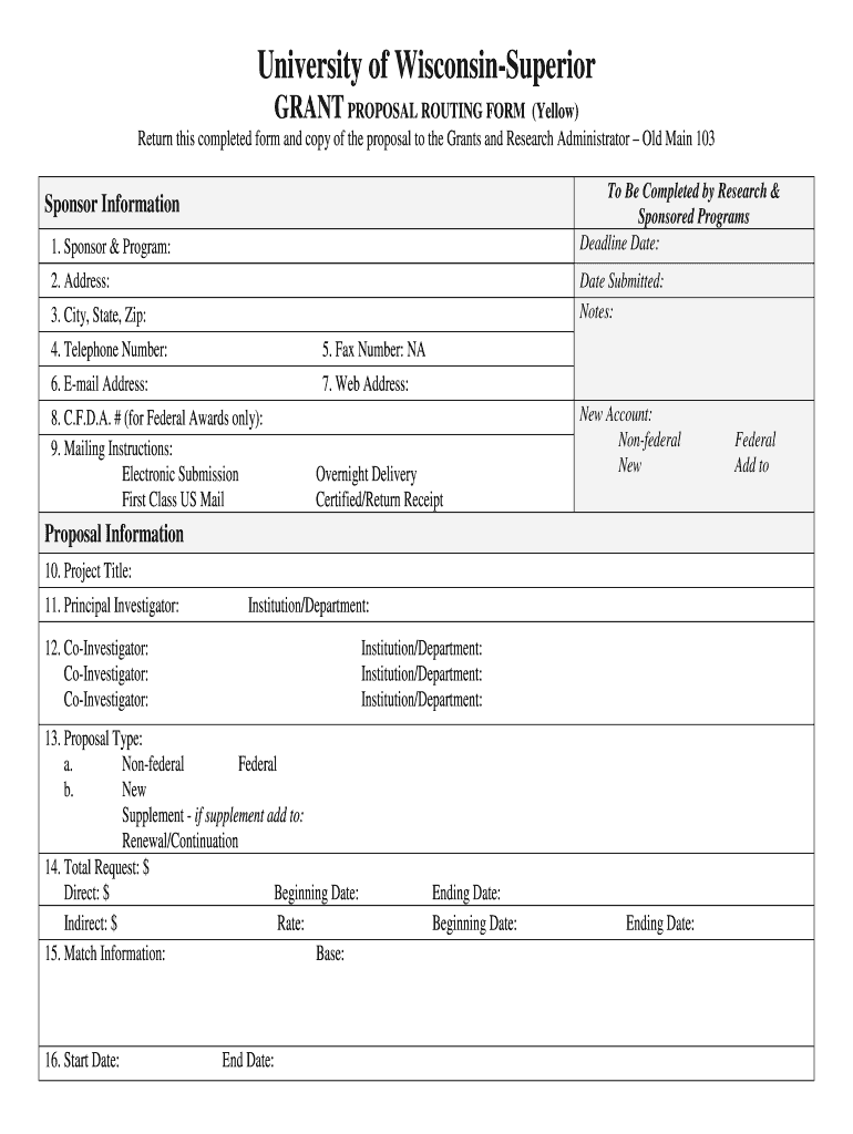 University of Wisconsin Superior GRANT PROPOSAL ROUTING FORM (Yellow) Return this completed form and copy of the proposal to the Grants and Research Administrator Old Main 103 To Be Completed by Research