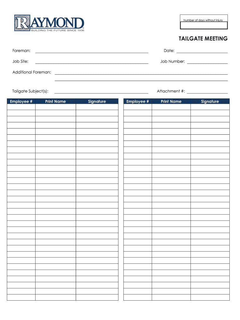 Number of days without injury TAILGATE MEETING Foreman: Date: Job Site: Job Number: Additional Foreman: Tailgate Subject’s): Employee # Print Name Attachment #: Signature Employee # Print Name Signature