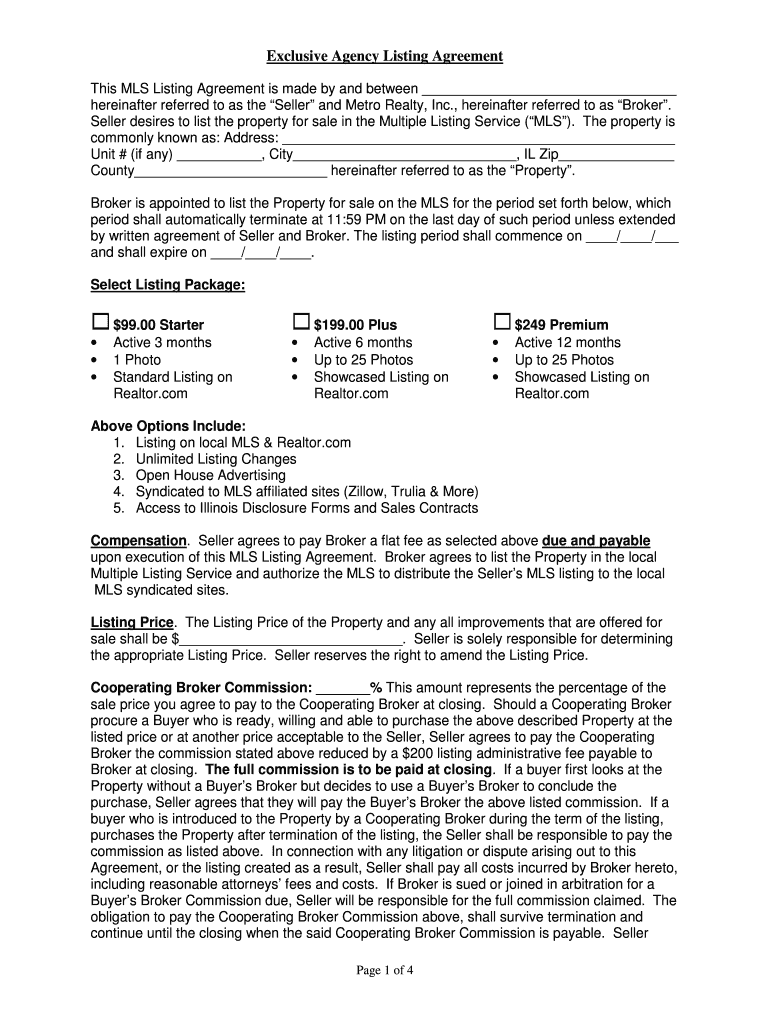 Exclusive Agency Listing Agreement This MLS Listing Agreement is made by and between hereinafter referred to as the Seller and Metro Realty, Inc., hereinafter referred to as Broker. Seller desires