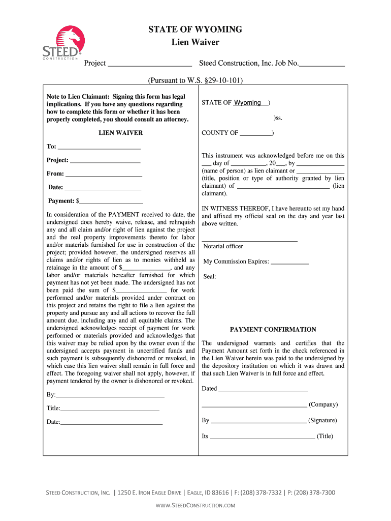 Get the free Wyoming Lien Waiver.pdf - Steed Construction