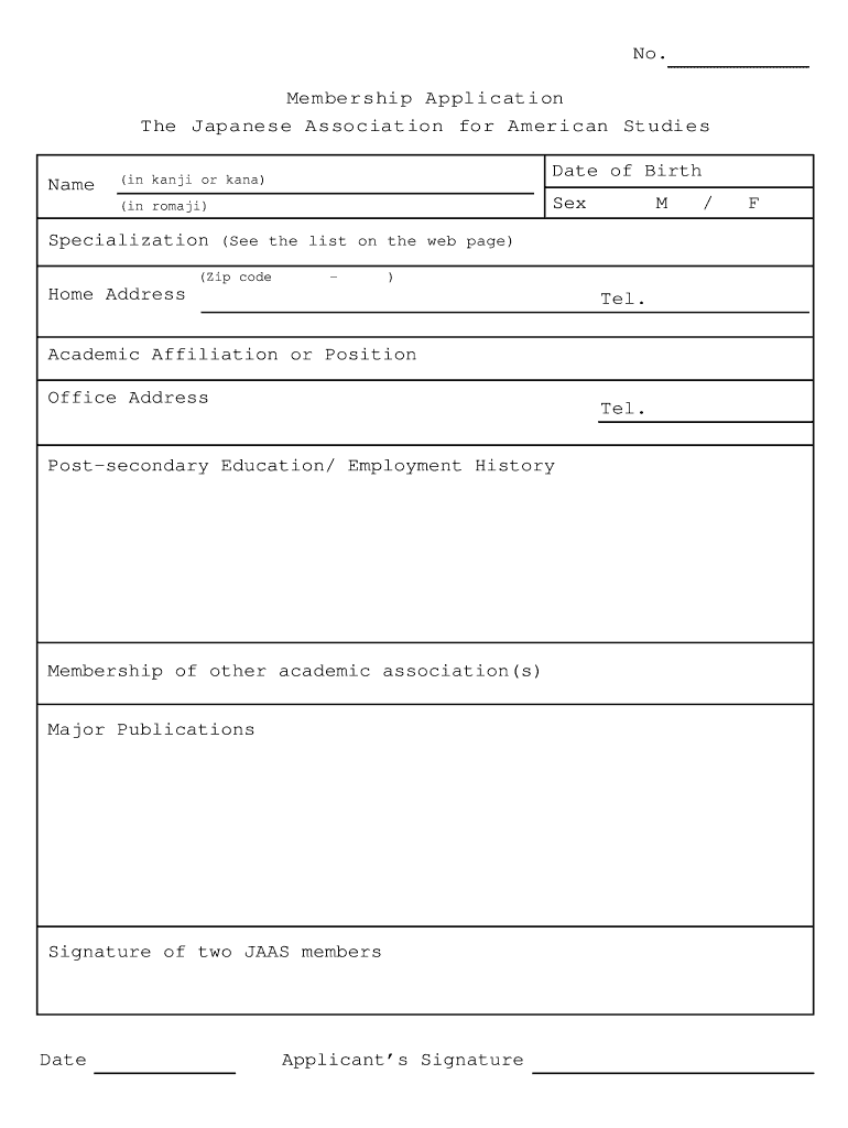 No. Membership Application The Japanese Association for American Studies Name Date of Birth (in kanji or kana) Sex (in Roman) M Specialization (See the list on the web page) (Zip code) Home Address