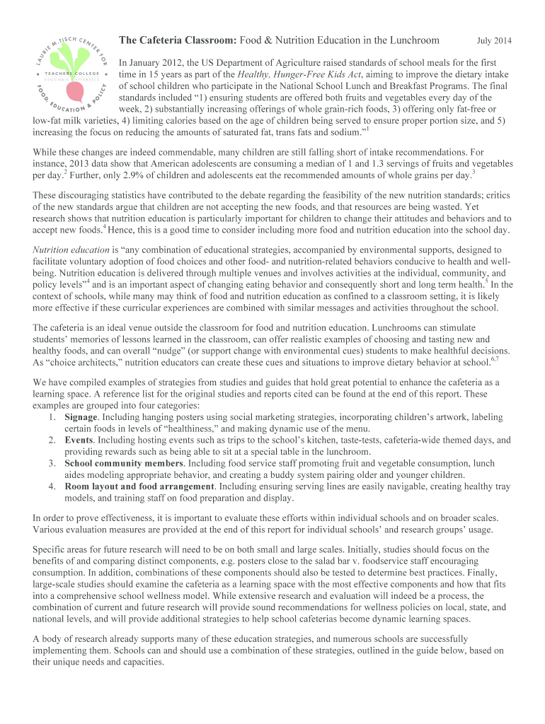 The Cafeteria Classroom: Food & Nutrition Education in the Lunchroom July 2014In January 2012, the US Department of Agriculture raised standards of school meals for the first time in 15 years as part