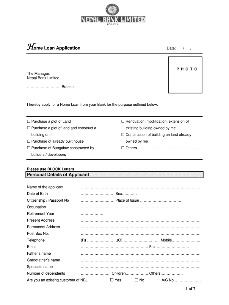 One Loan Application Date: / / P H O T O The Manager, Nepal Bank Limited, Branch I hereby apply for a Home Loan from your Bank for the purpose outlined below: Purchase a plot of Land Renovation, modification,