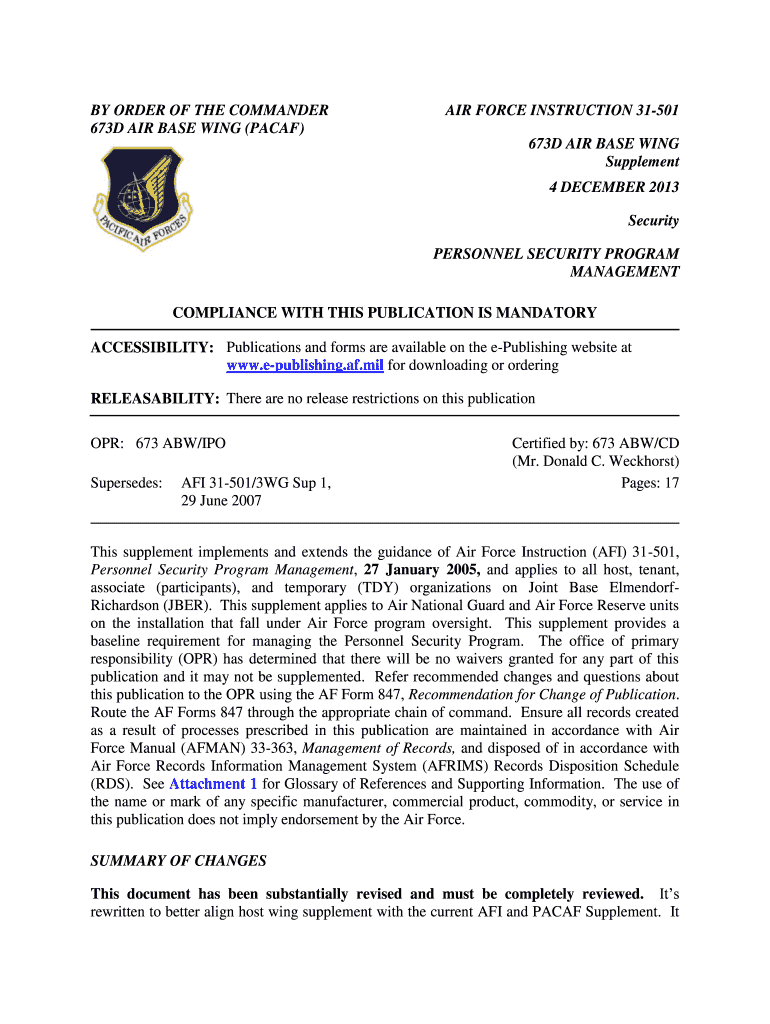BY ORDER OF THE COMMANDER 673D AIR BASE WING (PACA) AIR FORCE INSTRUCTION 31501 673D AIR BASE WING Supplement 4 DECEMBER 2013 Security PERSONNEL SECURITY PROGRAM MANAGEMENT COMPLIANCE WITH THIS PUBLICATION