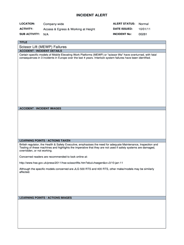INCIDENT ALERT LOCATION: Company wide ALERT STATUS: Normal ACTIVITY: Access & Egress & Working at Height DATE ISSUED: 10×01/11 SUB ACTIVITY: N×A INCIDENT No: 00281 TITLE Scissor Lift (MEW) Failures
