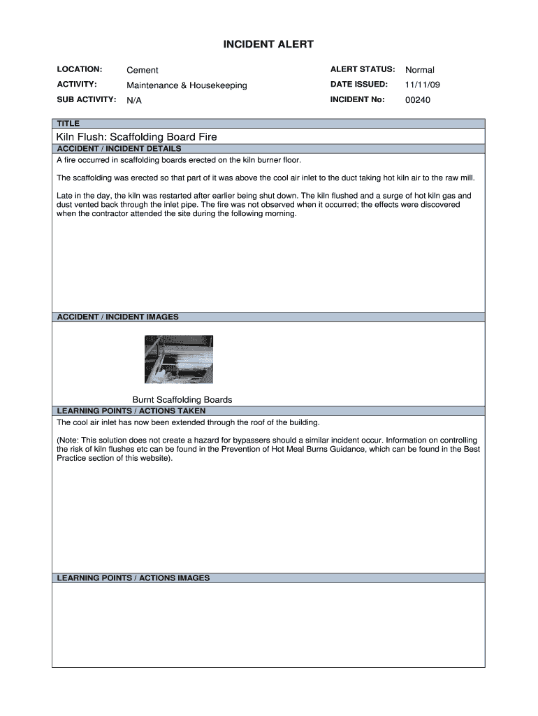 INCIDENT ALERT LOCATION: Cement ALERT STATUS: Normal ACTIVITY: Maintenance & Housekeeping DATE ISSUED: 11×11/09 SUB ACTIVITY: N×A INCIDENT No: 00240 TITLE Kiln Flush: Scaffolding Board Fire ACCIDENT