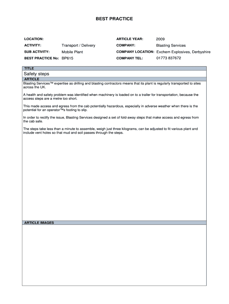 BEST PRACTICE ARTICLE YEAR: LOCATION: 2009 Blasting Services ACTIVITY: Transport / Delivery COMPANY: SUB ACTIVITY: Mobile Plant COMPANY LOCATION: Ex chem Explosives, Derbyshire BEST PRACTICE No: BP615