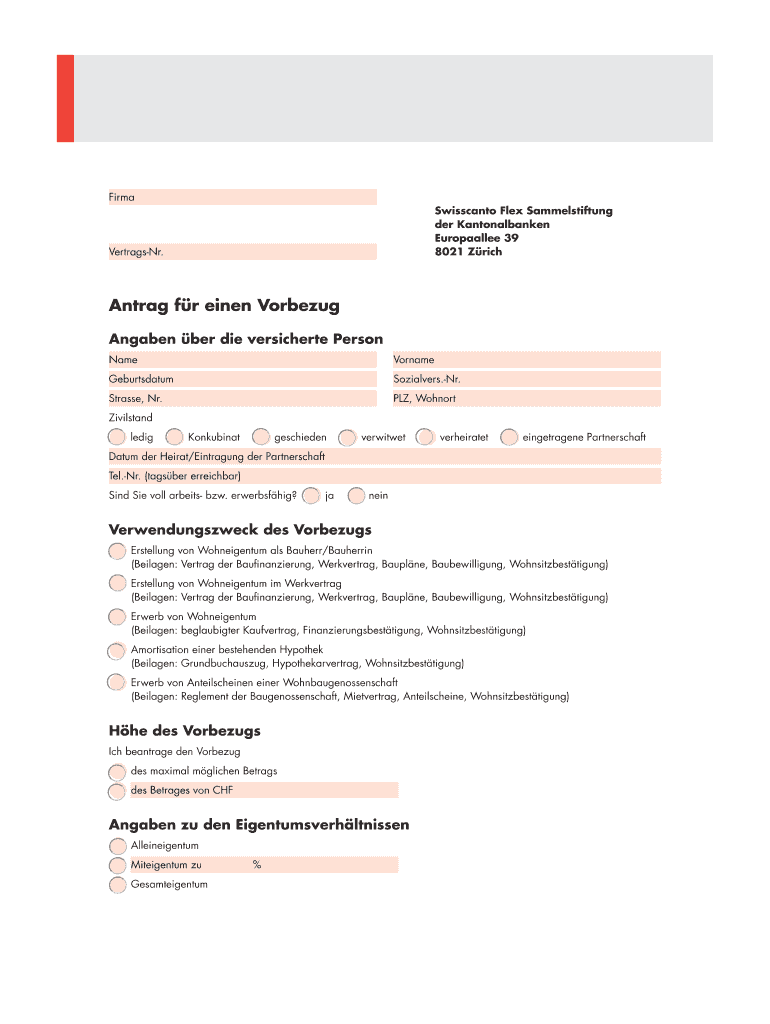 Firm Swiss canto Flex Sammelstiftung her Kantonalbanken Europaallee 39 VertragsNr. 8021 Rich Ant rag for linen Vorbezug Annabel BER die versicherte Person Name Surname Geburtsdatum Silvers. NR. Stress,