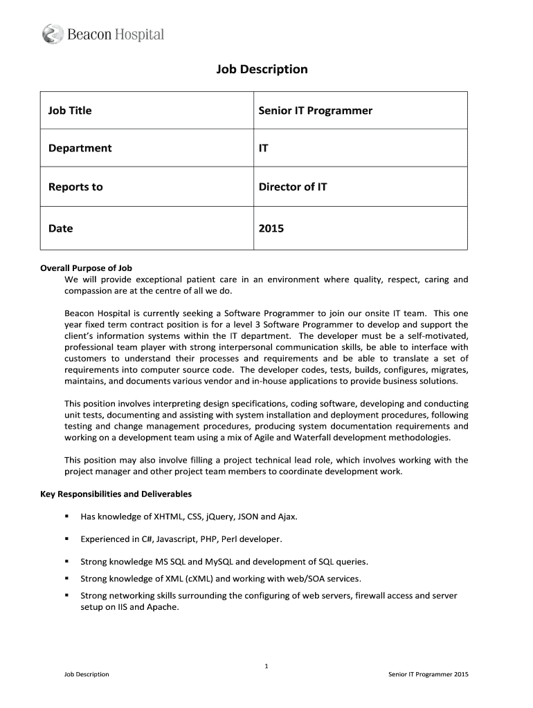 Job Description Job Title Senior IT Programmer Department IT Reports to Director of IT Date 2015 Overall Purpose of Job We will provide exceptional patient care in an environment where quality, respect,