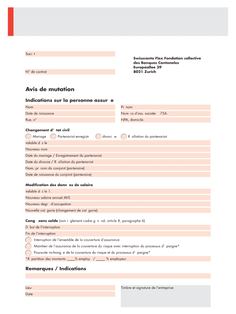 So cit Swiss canto Flex Foundation collective DES Banquet Canton ales Europaallee 39 N de contract 8021 Zurich Avis de mutation Indications SUR la personnel assure Not Prom Date de Renaissance Humor