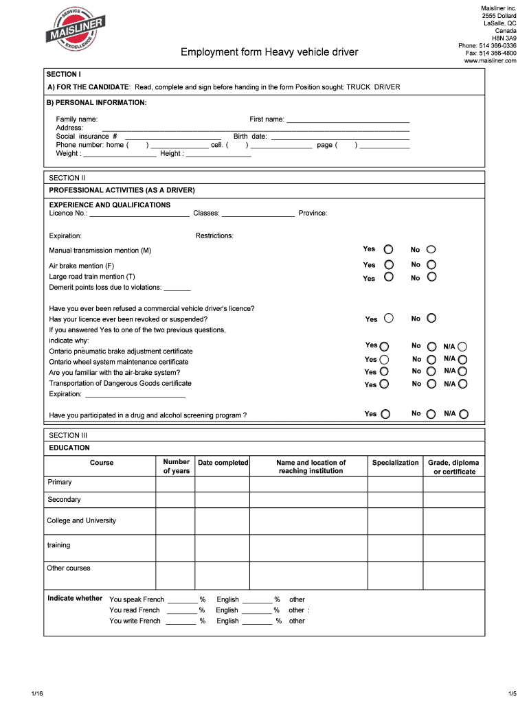 Mainline inc. 2555 Dollar Basally, QC Canada H8N 3A9 Phone: 514 3660336 Fax: 514 3664800 www.maisliner.com Employment form Heavy vehicle driver SECTION I Am) FOR THE CANDIDATE: Read, complete and