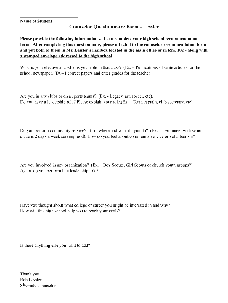 Name of Student Counselor Questionnaire Form Lesser Please provide the following information, so I can complete your high school recommendation form. After completing this questionnaire, please attach
