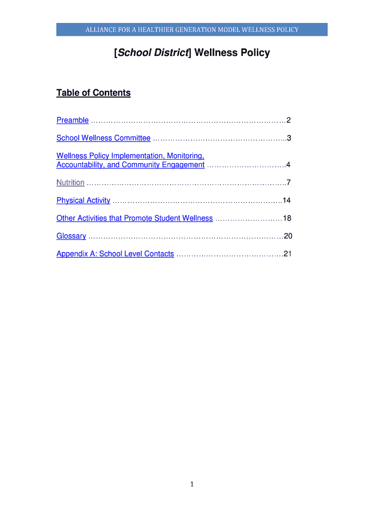 Get the free ALLIANCE FOR A HEALTHIER GENERATION MODEL WELLNESS POLICY School District Wellness P...