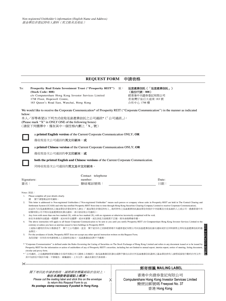 Nonregistered Unit holders' information (English Name and Address) REQUEST FORM To: Prosperity Real Estate Investment Trust (Prosperity REIT) (Stock Code: 808× c×o Computer share Hong Kong Investor