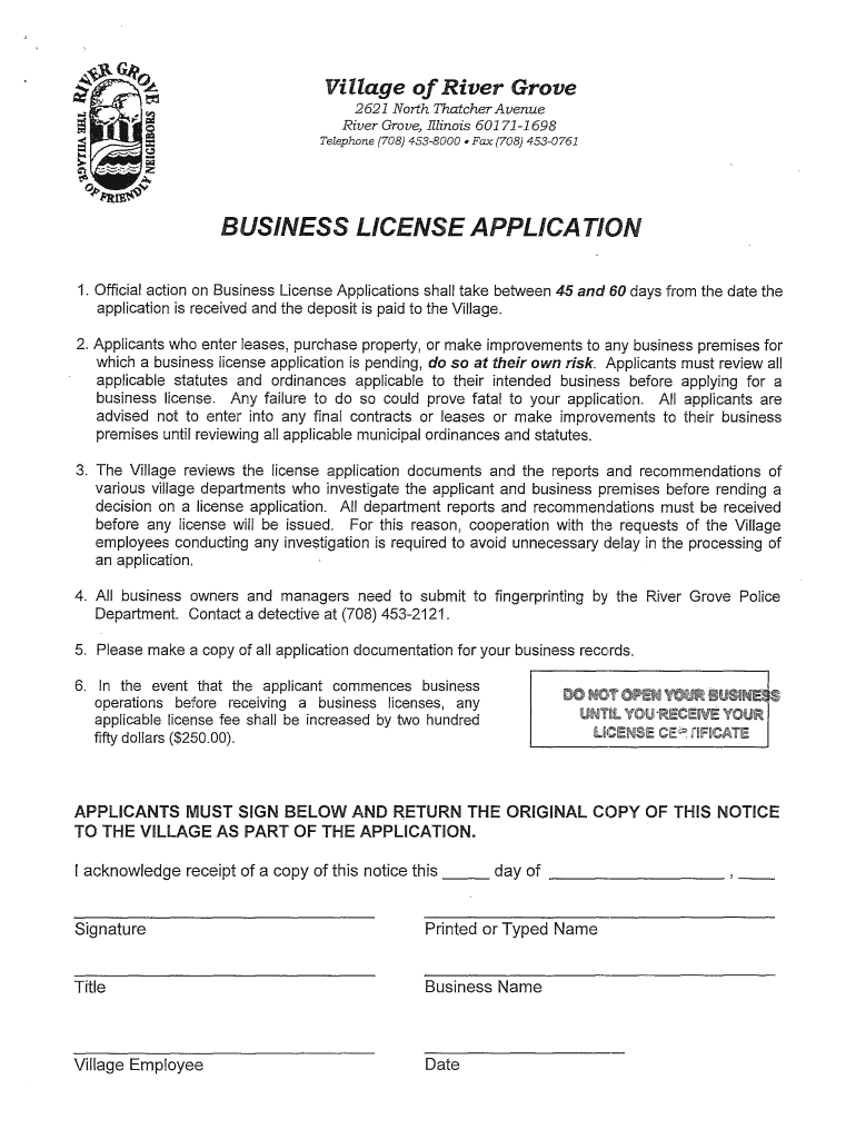 Village of River Grove 2621 North Thatcher Avenue River Grove, Illinois 601711698 Telephone (708× 4538000 Fax (708× 4530761 BUSINESS LICENSE APPLICATION 1. Official action on Business License Applications