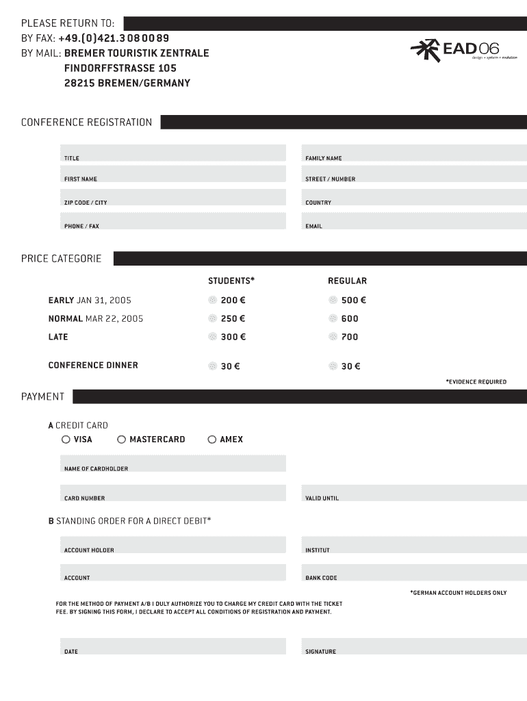 PLEASE RETURN TO: BY FAX: +49.×0)421.3 08 00 89 BY MAIL: BREMEN TOURISTIC CENTRAL FINDORFFSTRASSE 105 28215 BREMEN×GERMANY CONFERENCE REGISTRATION TITLE FAMILY NAME FIRST NAME STREET / NUMBER ZIP