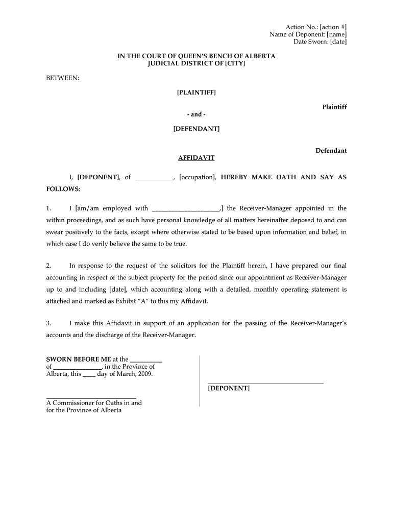 The Affidavit for Receiver-Manager is a legal document used by deponents in Alberta to support applications for passing their Receiver-Manager's accounts and their discharge.