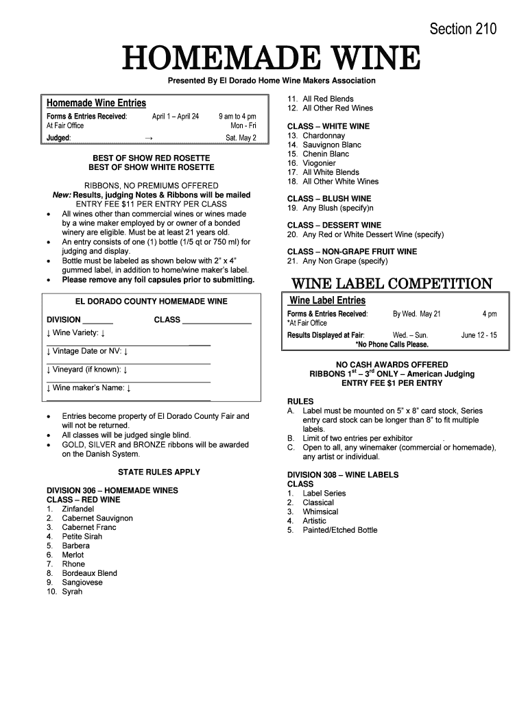 Section 210 HOMEMADE WINE Presented By El Dorado Home winemakers Association Homemade Wine Entries Forms & Entries Received: At Fair Office Judged: April 1 April 24 9 am to 4 pm Mon Fri Sat. May 2