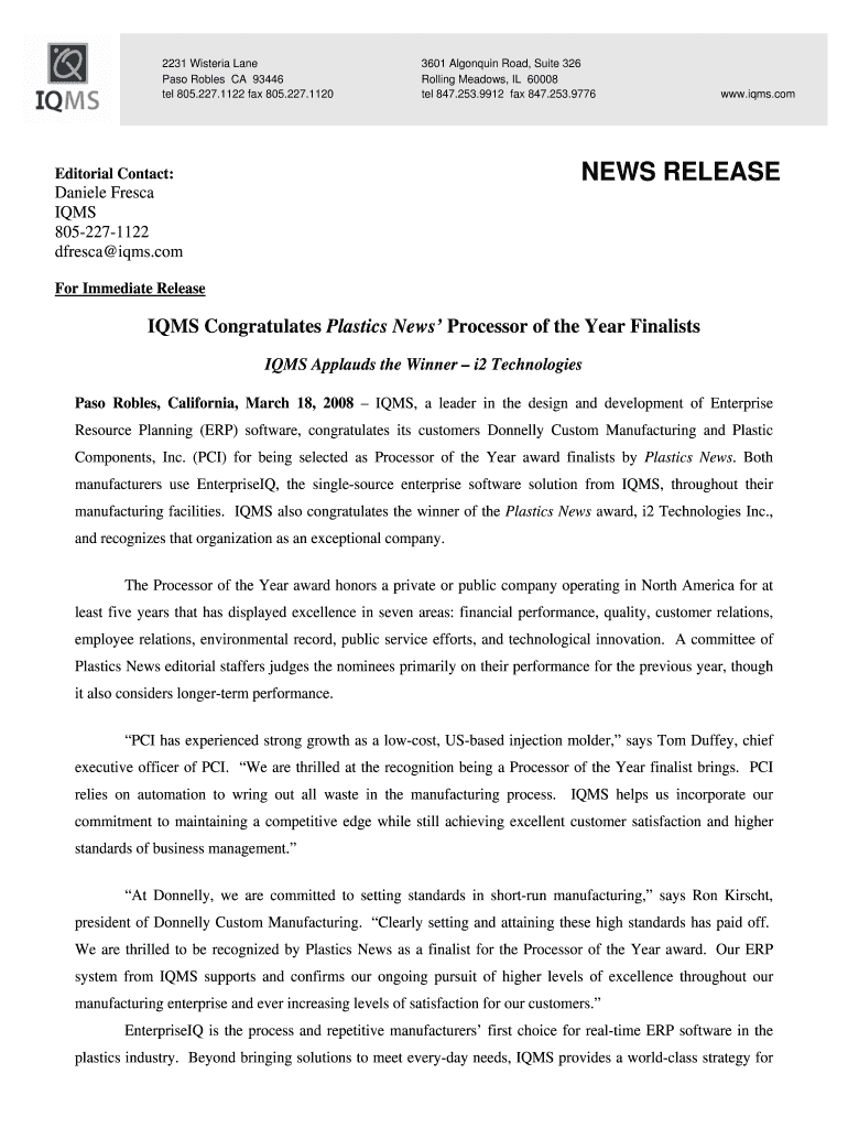 2231 Wisteria Lane Pass Robles CA 93446 tel 805.227.1122 fax 805.227.1120 3601 Algonquin Road, Suite 326 Rolling Meadows, IL 60008 tel 847.253.9912 fax 847.253.9776 www.iqms.com NEWS RELEASE Editorial