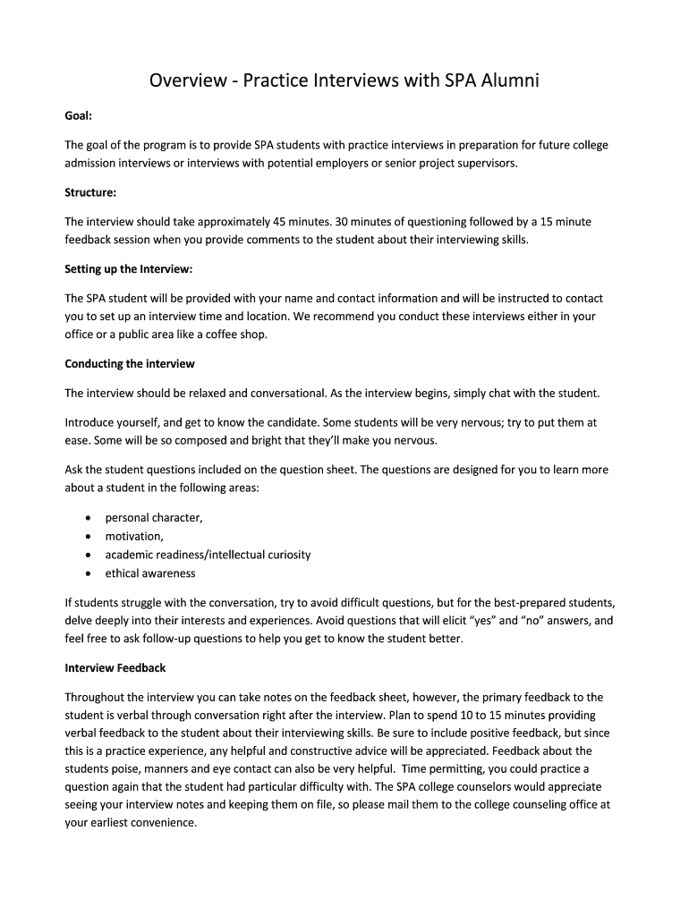 Overview Practice Interviews with SPA Alumni Goal: The goal of the program is to provide SPA students with practice interviews in preparation for future college admission interviews or interviews