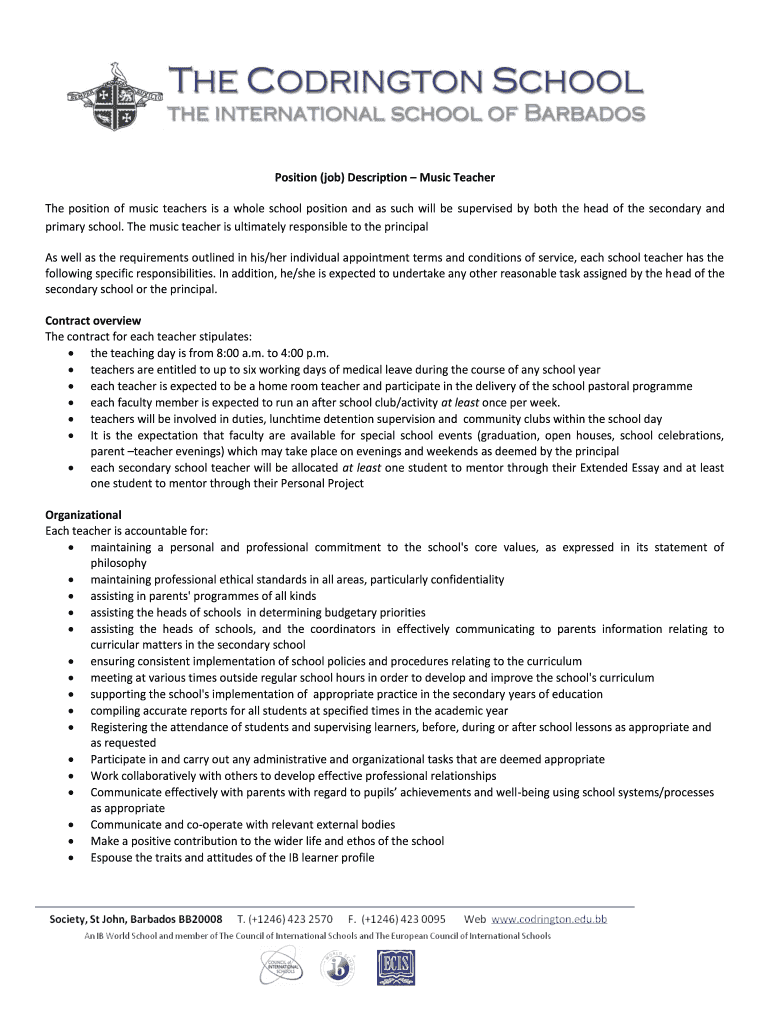 Get the free (job) Description Music Teacher The position of music teachers is ... - codrington edu