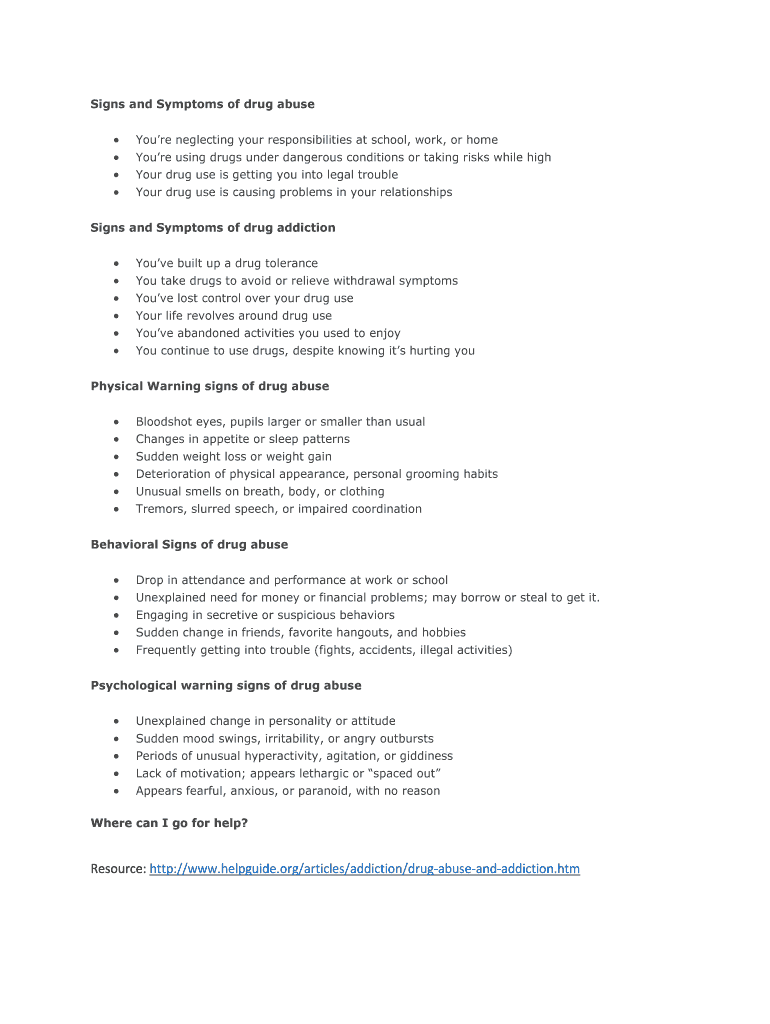Signs and Symptoms of drug abuse You're neglecting your responsibilities at school, work, or home You're using drugs under dangerous conditions or taking risks while high Your drug use is getting