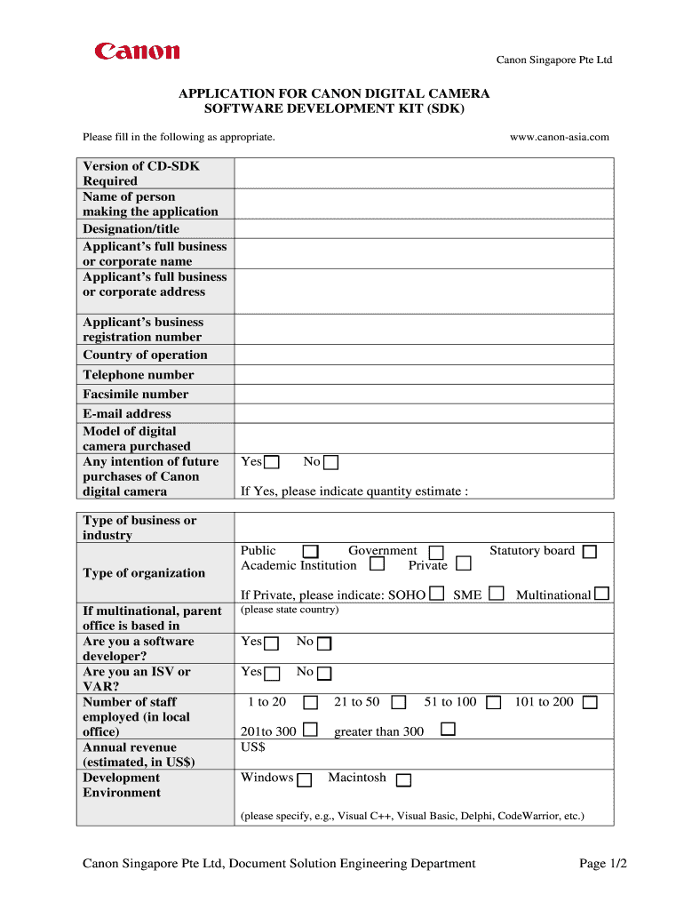 The Canon Digital Camera SDK Application Form is a vendor registration form used by individuals or companies to apply for the Canon Digital Camera Software Development Kit (SDK).