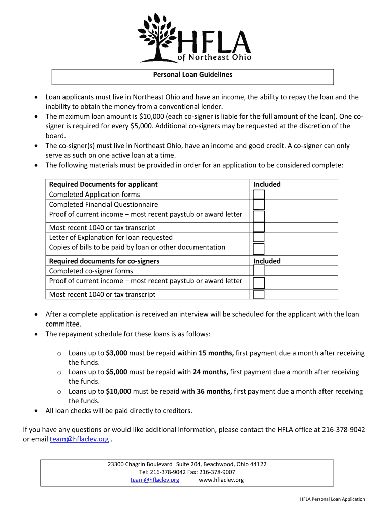 Personal Loan Guidelines Loan applicants must live in Northeast Ohio and have an income, the ability to repay the loan and the inability to obtain the money from a conventional lender. The maximum