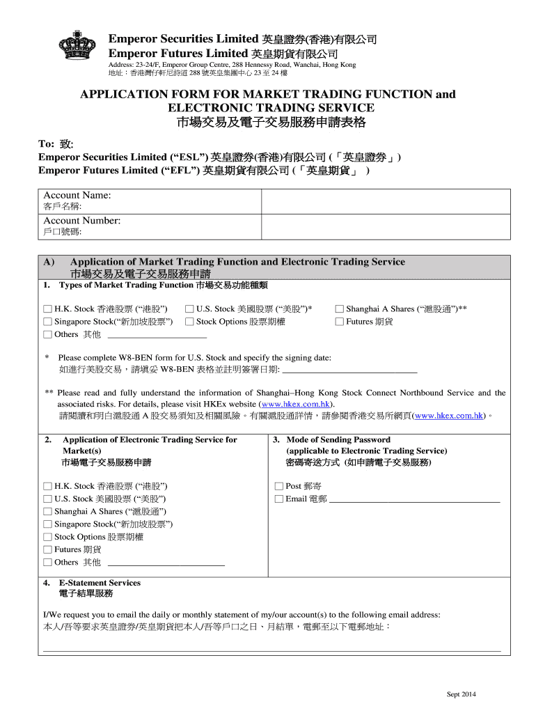 Emperor Securities Limited () Emperor Futures Limited Address: 2324×F, Emperor Group Center, 288 Hennessy Road, Anchal, Hong Kong 288 23 24 APPLICATION FORM FOR MARKET TRADING FUNCTION and ELECTRONIC