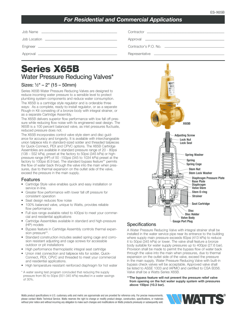 This document outlines the specifications, features, and installation requirements for the Series X65B Water Pressure Reducing Valves designed for residential and commercial applications.