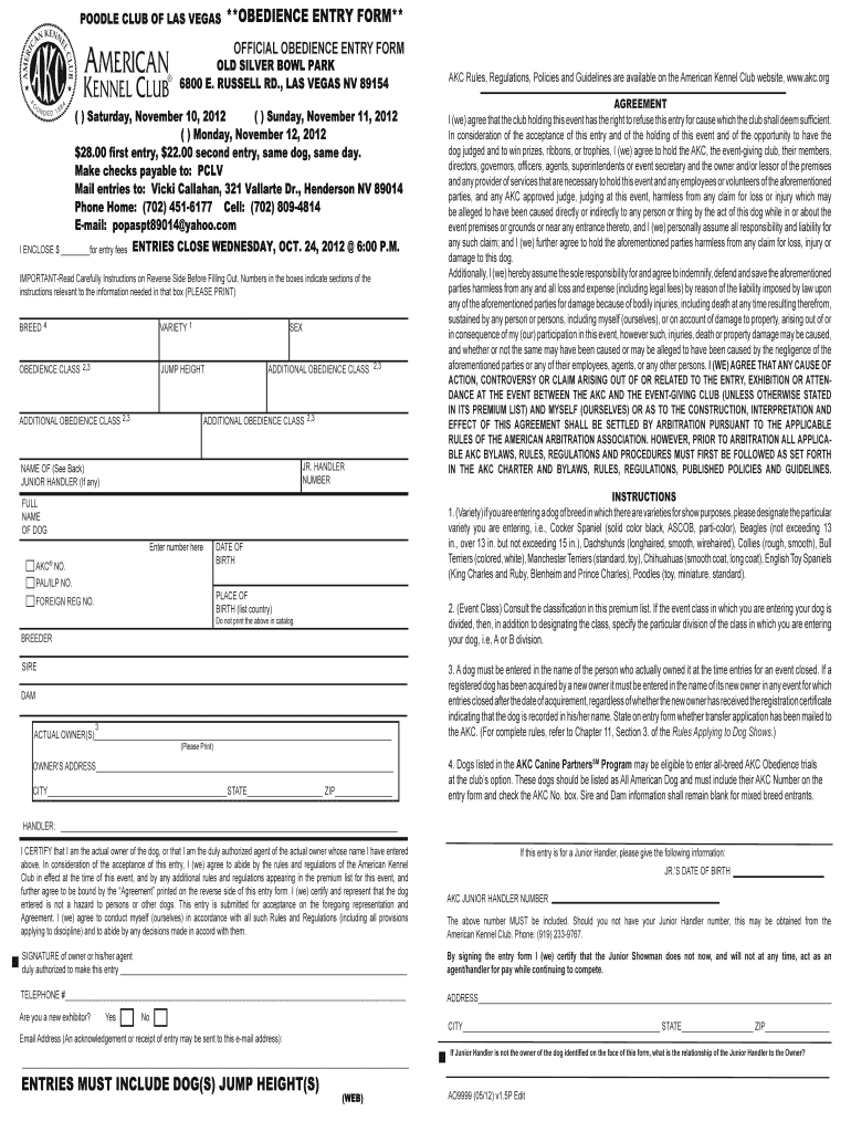 Get the free **OBEDIENCE ENTRY FORM** - poodlecluboflasvegas