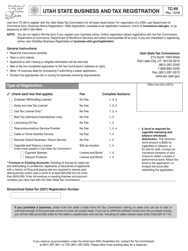 This form is used to register with the Utah State Tax Commission for various taxes, and includes instructions for completing the form as well as requirements for different types of business licensing.