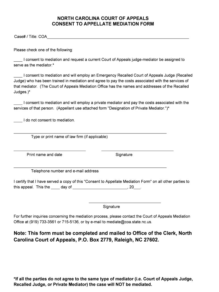 NORTH CAROLINA COURT OF APPEALS CONSENT TO APPELLATE MEDIATION FORM Case# / Title: COA Please check one of the following: I consent to mediation and request a current Court of Appeals judge mediator