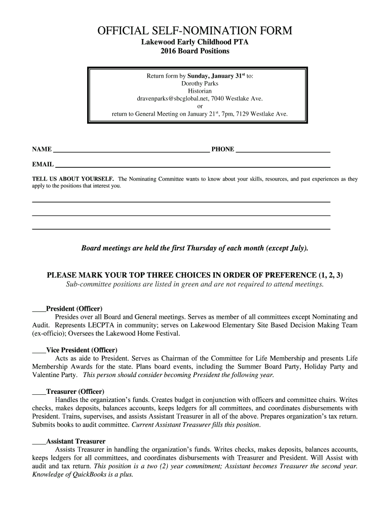 OFFICIAL DENOMINATION FORM Lakewood Early Childhood PTA 2016 Board Positions Return form by Sunday, January 31st to: Dorothy Parks Historian davenports global.net, 7040 Westlake Ave. or return to