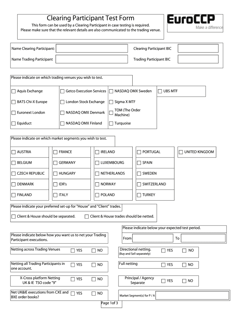 Clearing Participant Test Form This form can be used by a Clearing Participant in case testing is required. Please make sure that the relevant details are also communicated to the trading venue. Name