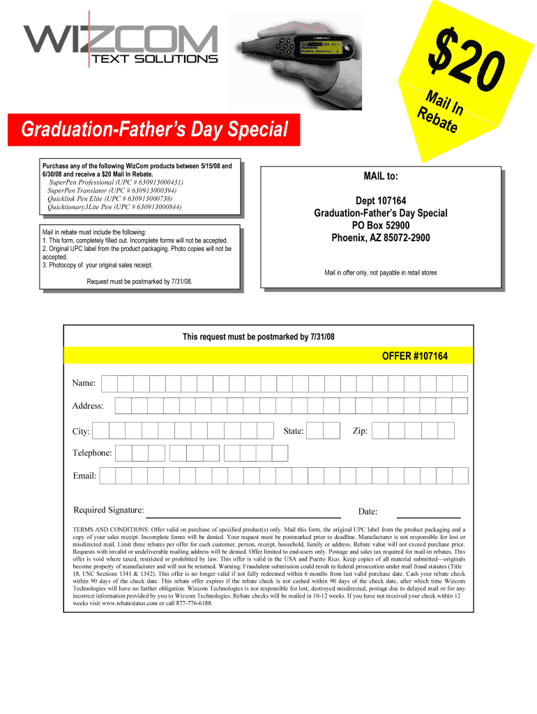 The WizCom rebate offer requires the submission of the completed form along with necessary documentation, such as the original UPC label and receipt. Using a mail in rebate template simplifies the submission process.