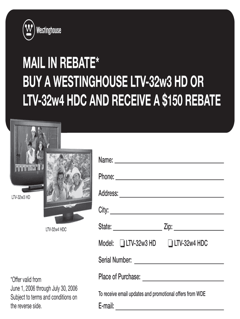 The Westinghouse TV Mail-In Rebate Form allows customers who purchased specific Westinghouse TVs, namely the LTV-32w3 HD or LTV-32w4 HDC, to claim a rebate of $150. This rebate offer is marked by its eligibility criteria, particularly focusing on purchases made between June 1, 2006, and July 30, 2006.